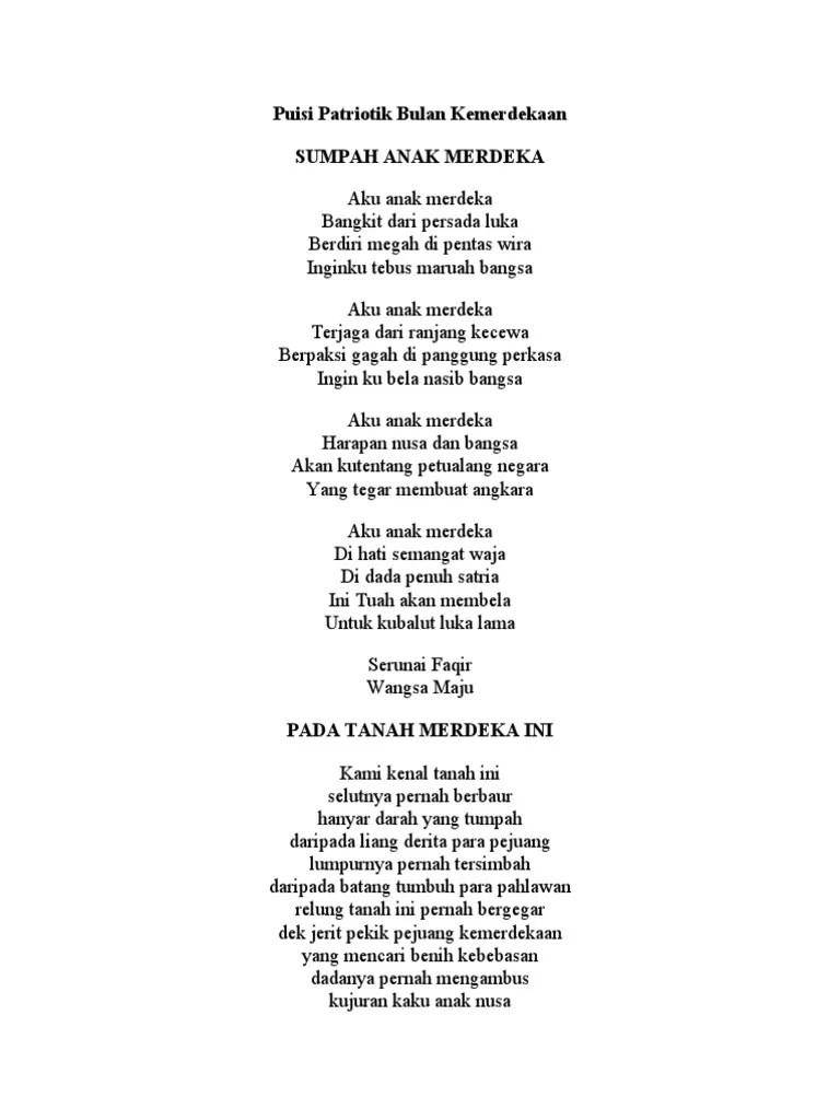 Setiap 17 agustus bangsa indonesia memperingati momen spesial hari kemerdekaan. Ada yang bertema pandemi hingga pahlawan seperti dirangkum dari buku antologi puisi kemerdekaan indonesia. Taufiq ismail · jakarta 17 agustus . Sebuah negeri yang menjadi tempat diriku dan lainnya dilahirkan. Puisi untuk indonesia · ketika ku terpaku · menatap negeri nan rapuh · melihat korupsi nan riuh · merasa kesatuan nan luruh · tapi para pejabat . Kumpulan puisi tentang kemerdekaan indonesia akan menjadikan kita nasionalis. Berikut ini jatimnetwork.com bagikan kumpulan contoh puisi tentang kemerdekaan indonesia yang pendek, puitis, dan cocok digunakan sebagai . Tema yang diangkat pun banyak mulai dari perjuangan pahlawan, hari kemerdekaan, hingga kekayaan negeri indonesia. Kata indonesia inilah yang jadi tema puisi kita . Indonesia merupakan sebuah negara kepulauan terbesar di dunia yg terletak di asia tenggara.